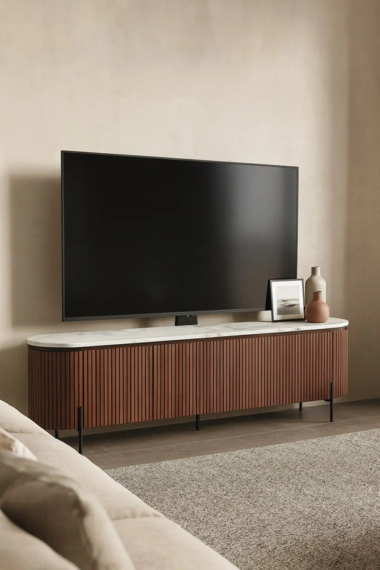 حامل تلفزيون من الرخام الصناعي بطول ٢٠٠ سم - وحدة وسائط أنيقة وواسعة تضفي على غرفة معيشتك مظهرًا فاخرًا للرخام مع متانة تدوم طويلًا. مثالية لأصحاب المنازل الذين يرغبون في تصميم أنيق دون ثقل أو تكلفة الحجر الطبيعي. - سطح واسع (200 × 40 × 55 سم) لاستيعاب أجهزة التلفزيون...